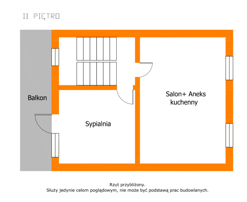 - II piętro: salon z aneksem kuchennym, sypialnia, łazienka