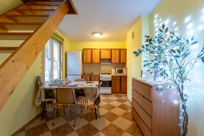 - I piętro: jadalnia, kuchnia, sypialnia, łazienka