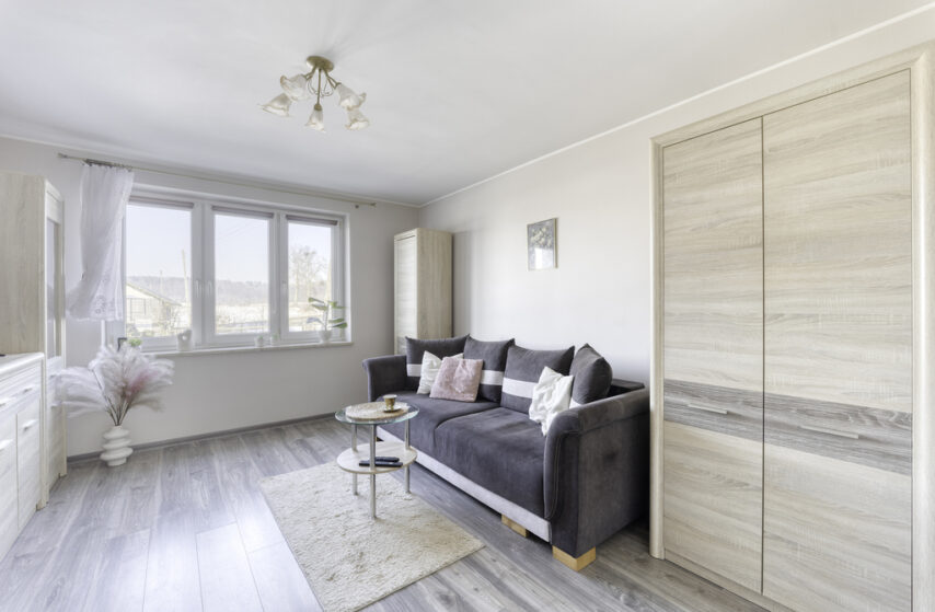 To przytulne, jednopokojowe mieszkanie o powierzchni 36,8 metrów kwadratowych mieści się na parterze budynku z 1968 roku.