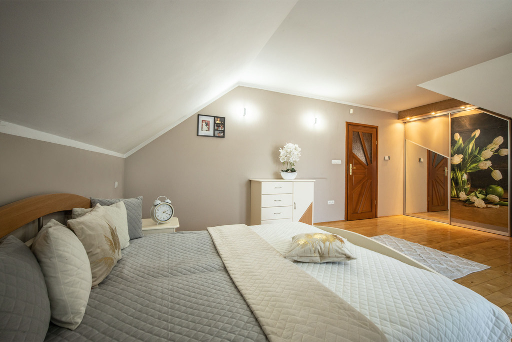 Na piętrze mieszczą się cztery pokoje, w tym jeden z dużą garderobą, a dwa z balkonem. Wszystkie pomieszczenia wraz z przedpokojem zostały wykończone ponadczasową, drewnianą, dębową deską. Na tym poziomie znajduje się również druga, większa łazienka – wyposażona w wannę z hydromasażem. Z piętra jest wejście na strych, który można przekształcić w dodatkową przestrzeń.