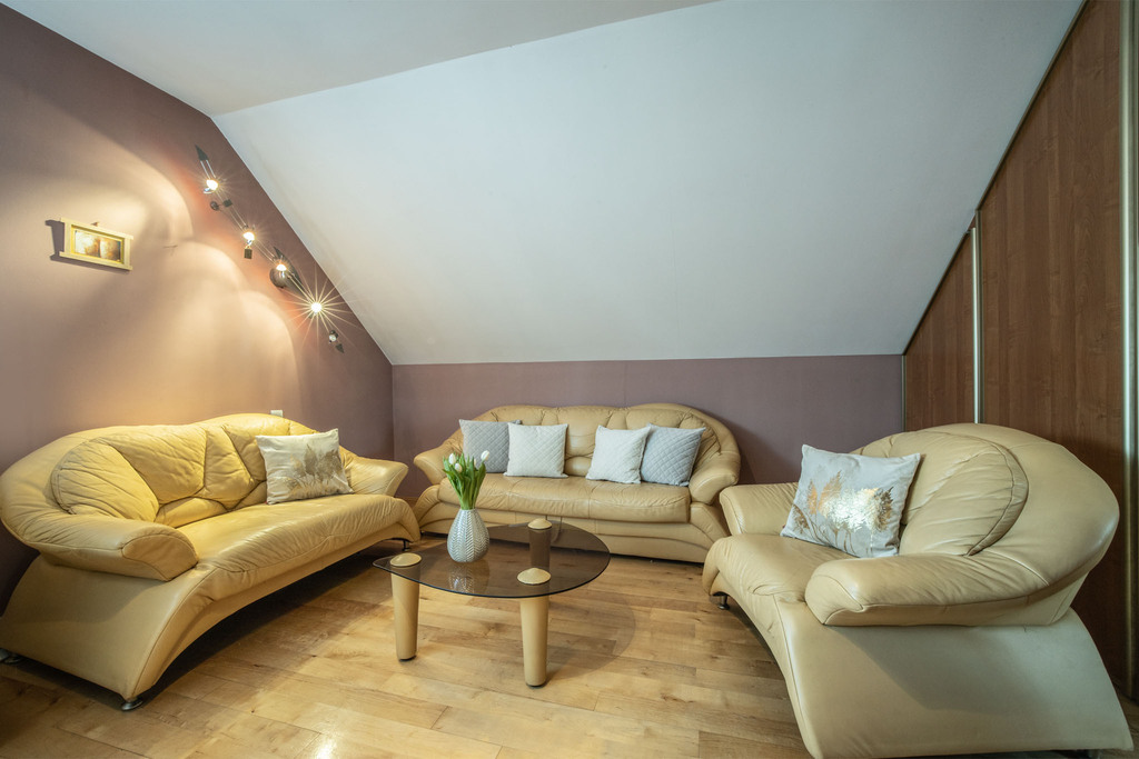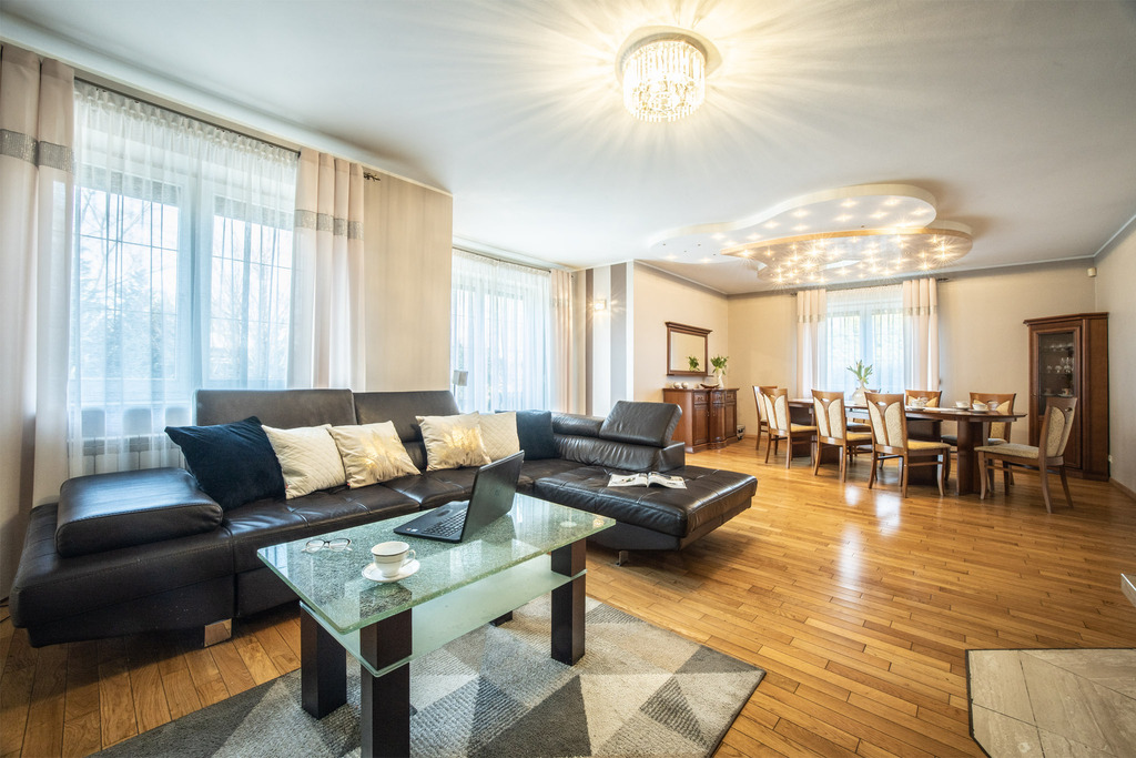 W holu, kuchni i jadalni podłogi wyłożono marmurem, który w połączeniu z dębowym parkietem w salonie tworzy harmonijną całość. Marmurowe schody z subtelnym podświetleniem stanowią zaś efektowną ozdobę wnętrza.