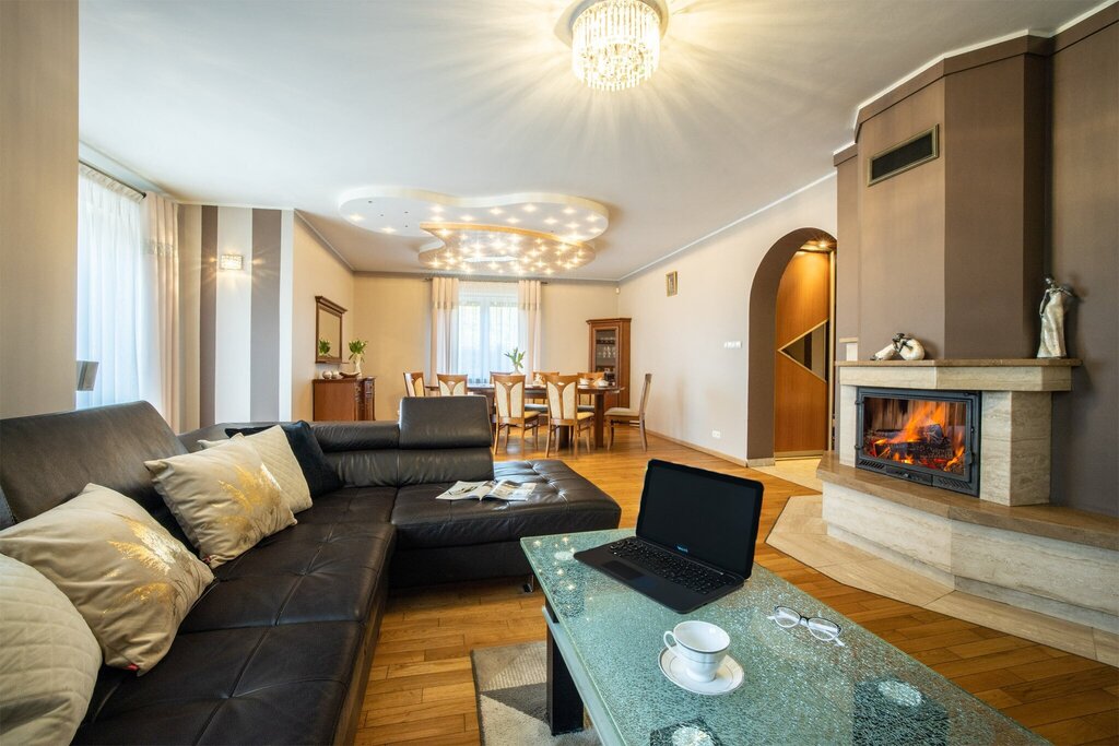 Przekraczając próg domu, wchodzimy do wiatrołapu, a tuż za nim znajduje się przestronny hol. Jego marmurowa podłoga od razu przyciąga wzrok, nadając wnętrzu elegancki i klasyczny charakter już od pierwszych chwil. Hol płynnie przechodzi w imponujący wielkością salon – to bez wątpienia serce tego domu. Pomieszczenie dzieli się na strefę relaksu, której ozdobą jest klimatyczny kominek oraz przestronną strefę jadalnianą, zapewniającą wygodę podczas rodzinnych spotkań przy dużym stole. Z tej części prowadzi wyjście na obszerny taras oraz do ogrodu.