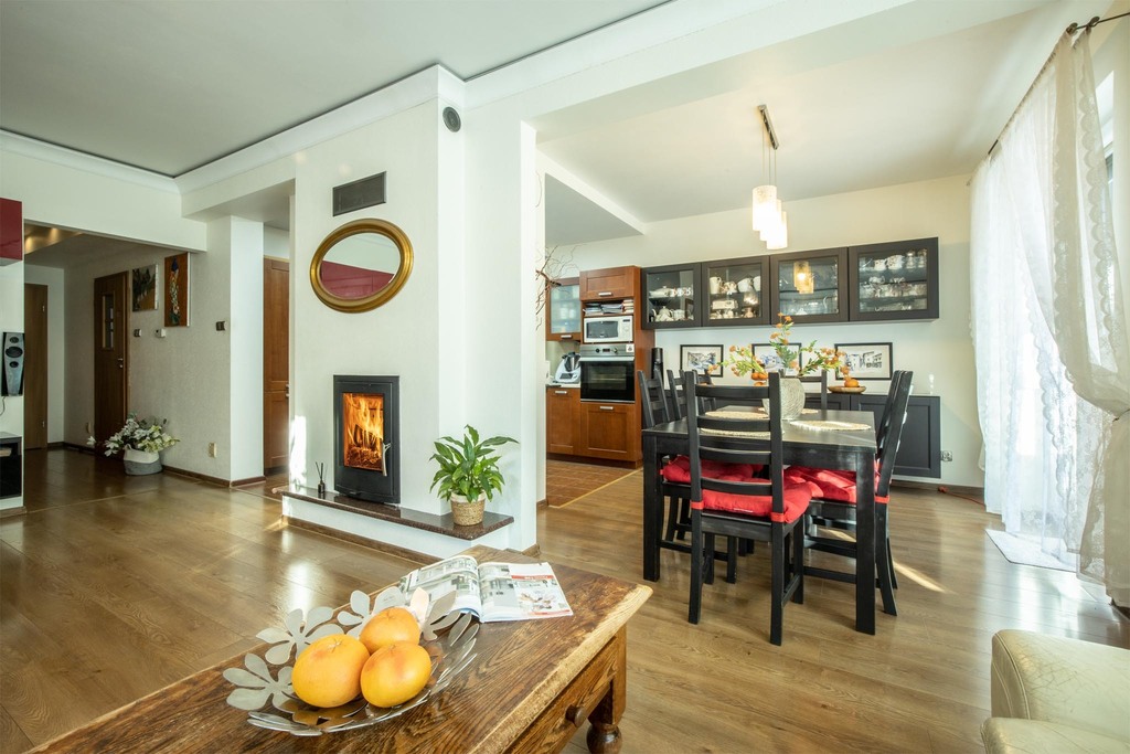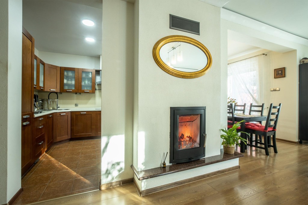 - Kominek: Wyposażony w system rozprowadzenia ciepła – nie tylko tworzy niepowtarzalny klimat, ale stanowi realne wsparcie grzewcze.