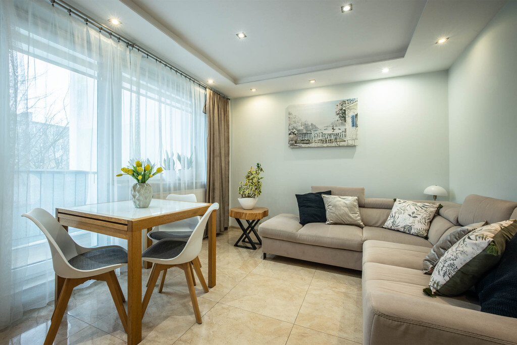 - Salon z wyjściem na balkon: Idealne miejsce na poranną kawę lub wieczorny relaks.