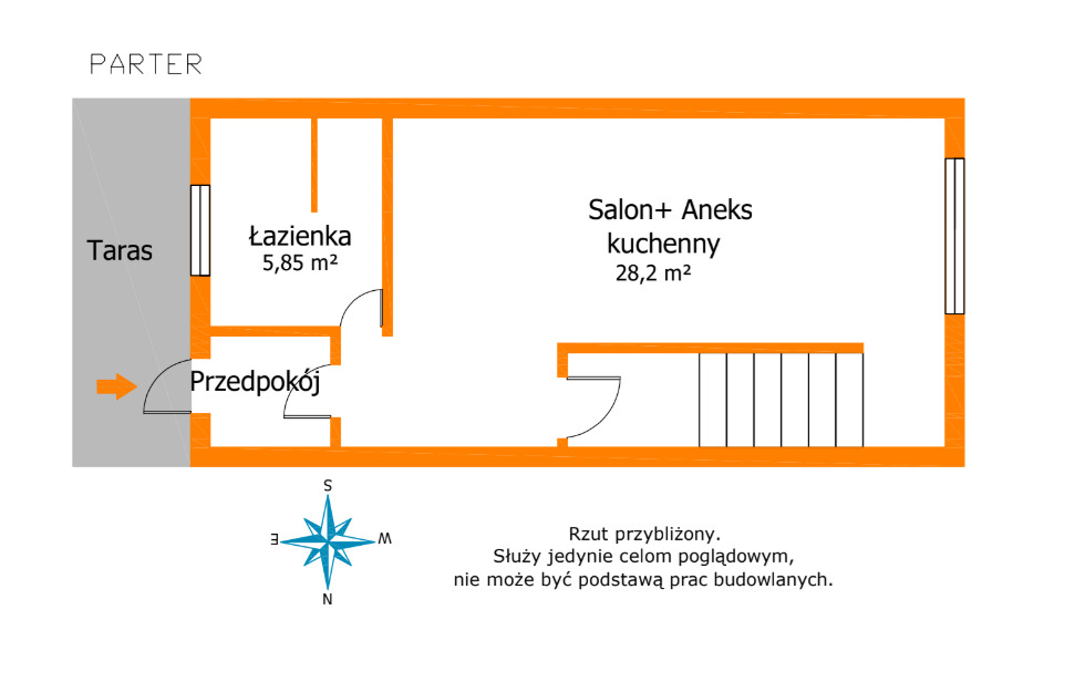 Parter : taras, przedpokój ,salon z kuchnią i łazienka .