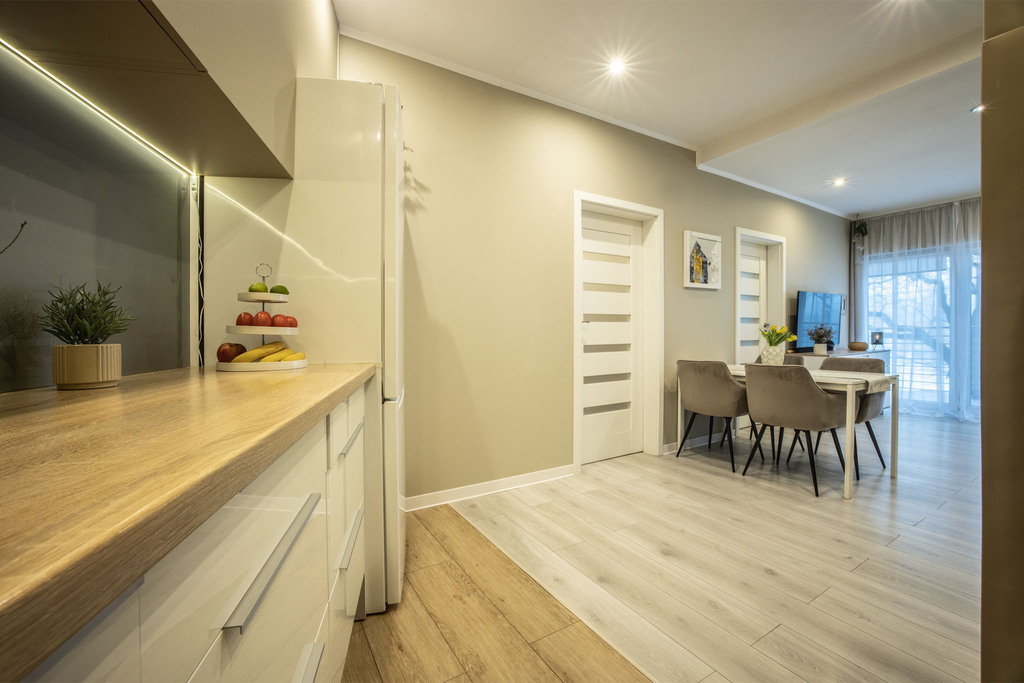 - Salon z aneksem kuchennym: Sercem domu jest jasny, przestronny pokój dzienny połączony z nowoczesnym aneksem. To idealna przestrzeń do wspólnego gotowania i relaksu.